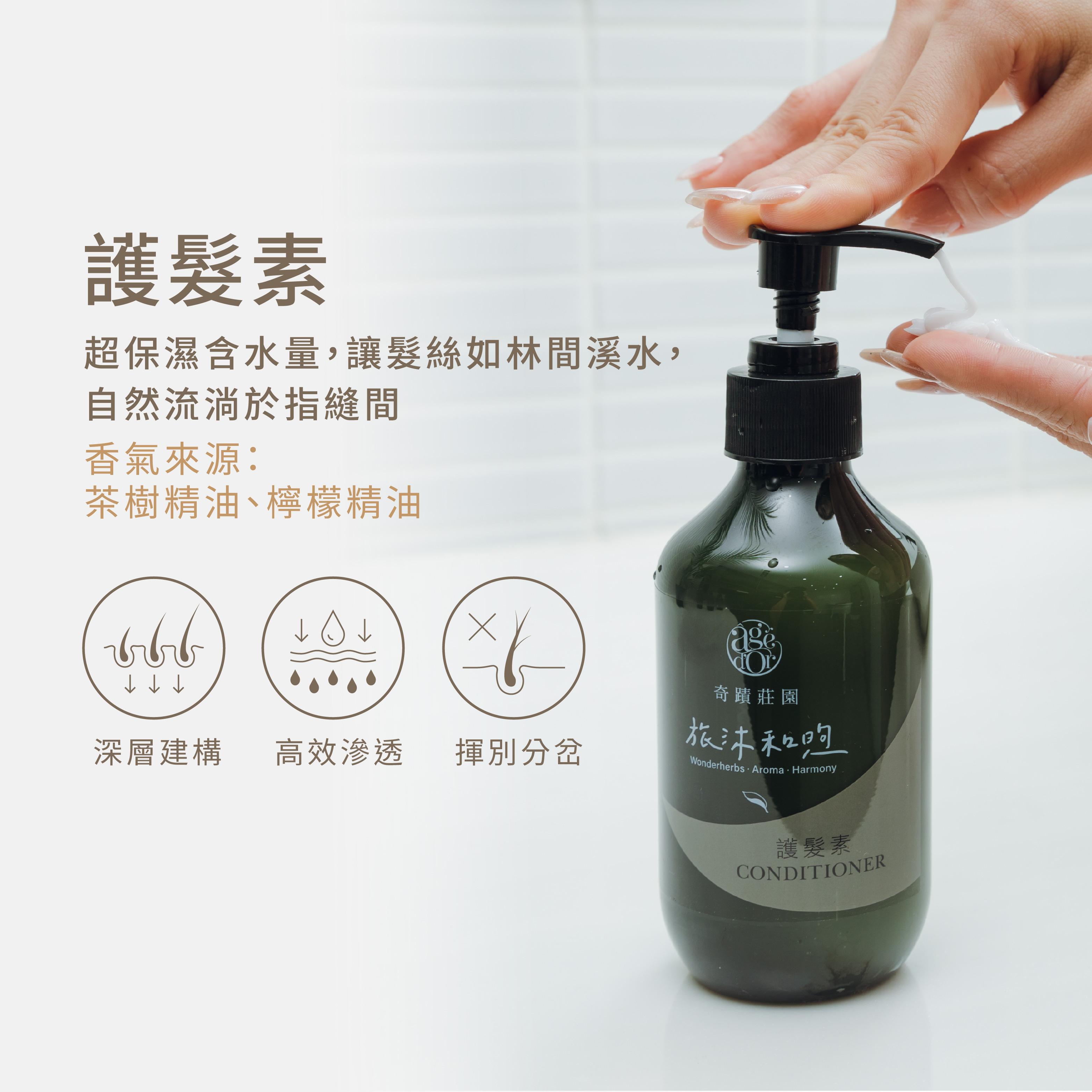 使用方法:清潔頭髮後吸乾水份,於髮尾塗抹適量護髮素,3分鐘後再以清水沖淨